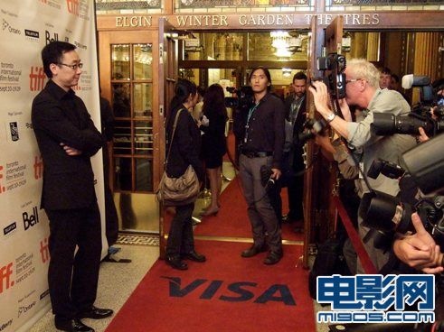 在影院门口接受外国媒体采访